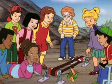 Ms. Frizzle arrives just in time on the Tugboat School Bus, and the class hop aboard. They make the water wheel along with a stick to hold the wheel, a spoon-like catapult, and pipes to roll the rocks through and onto the catapult to fling them upwardly the mountain. Unfortunately, the tension bar of the stick becomes jammed. So Wanda attempts to loosen information technology, with Ralphie assisting her. The catapult finally flings the rock, along with Ralphie, in the sky.